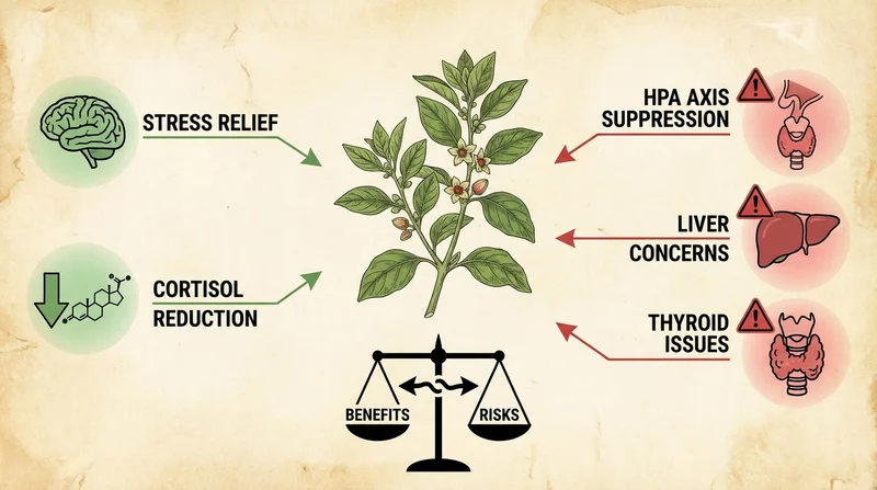 アシュワガンダのコルチゾール低下効果は、短期的にはストレス軽減として歓迎される。しかし、長期的にはHPA軸を抑制し、自力でコルチゾールを産生できなくなるリスクがある。
